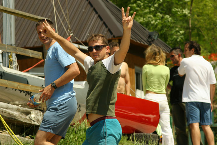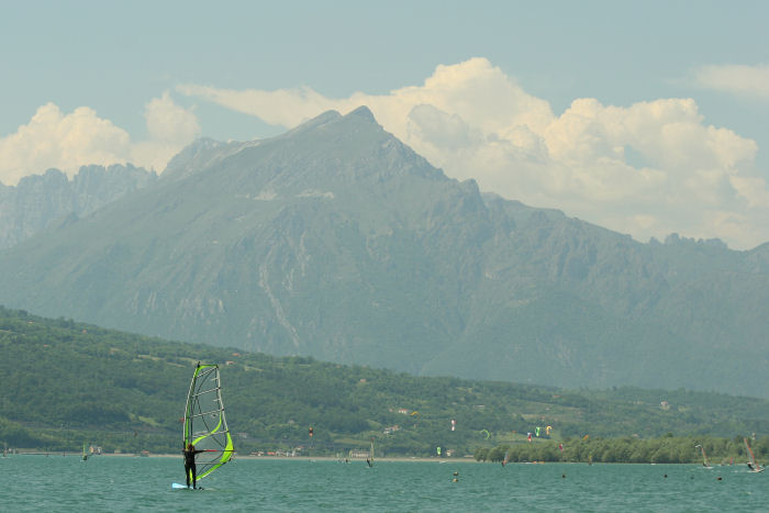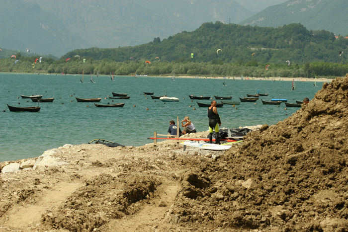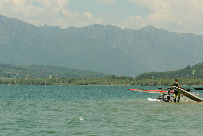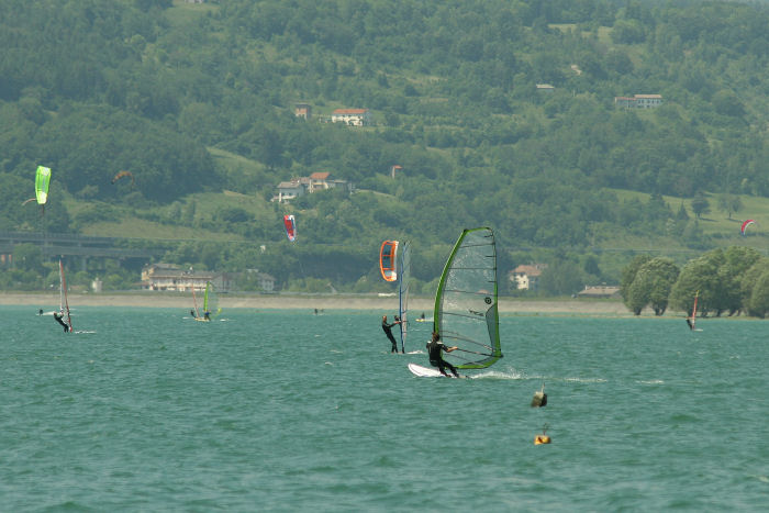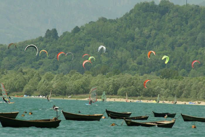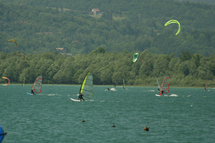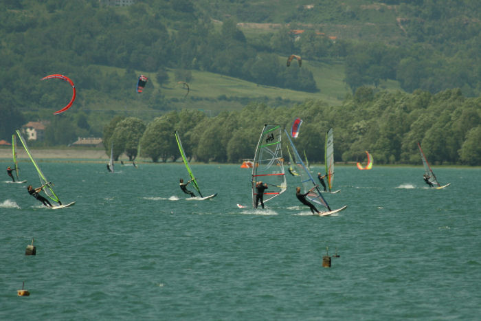 Lago di Santa Croce (LdSC) 'Radio BUM BUM Energy!!!'.. ne, začel sem pri koncu. To sem namreč poslušal na poti nazaj v Ljubljano. Ostala dva kandidata sta trdno spala, meni je prišel liguster na italijanskih avtocestah že čez glavo, zunaj pa 34 stopinj. Le v daljavi, nekje daleč bel oblak, kot smetana na sadni kupi. Samo majhen dežniček zapiknit vanj, bikinke, val in tropski veter! Pa je surfarija tukaj! Havaji!! Ja, tja bo treba na surfarijo, ker... 'Prejšnji teden se je na Lago di Sta Croce vozilo manj ko 5 kvadratov od poldneva do večera. Termika!'. In še res je bilo, ker smo vprašali domačine. Gremo tja in preverimo spot! Ekipa stara (Tomo, Pero - vetra ne bo! - in jaz), oprema seveda 4.7, 5.5 pa tako, za rezervo, če termika ne bi delala. Sicer pa napoved 35 stopinj, kar pomeni da mora žgati na polno!! .. GPS pozabili doma (seveda s kartami), zaupali viamichelin, nazadnje pa srečali na AC Mareta, ki ubira isto smer. Pa kaj se čemo zafrkavati s tehniko in kartami, Mare ve kam, mi za njim, pa je. Edino kar nam ni šlo v glavo je bilo to, da Mare nima deske.. ??? Kite? Kite in 4.7 jadra.. nekaj ne bo držalo.. LAGO !!!! Po napotkih je od Ljubljane do LdSC avtocesta, mi smo pa takoj za mestom Pordenone zavili z nje. Nekaj ne štima. Valjda, Mare se je zgubil.. se je takoj tudi našel, samo bolj ko smo mi gledali naše internet napotke s strani viamichelin, bolj je šlo vse mimo. Smeh v avtu, ker nas je vse skupaj spominjalo na lanski potep v Punat in iskanje poti iz Reke, na koncu pa se je izkazalo, da je naša karta zgrešila cca. 40 km in celo dolomitsko pregrado. Če ne bi bilo Mareta, bi se še sedaj lovili po Dolomitih.. GPS pa je bil na hladnem.. doma.. da se ne pokvari.. Pot LJ-LdSC je res ves čas avtocesta smer Ljubljana - Sežana - Pordenone - Beluno. Nič lažjega za najti. Cestnine (če odštejem naše) v eno stran cca. 9 Eur, vsega skupaj 230 km. 2 uri in pol avtocest, neskončnega ligustra in dolgočasne padske nižine.. Slika pa se precej spremeni na samem jezeru: spominja na Bohinjsko jezero, okrog visoke gore (žal malce zamegljene). Lepo! Tudi odsev v jezeru je bil enkraten.. ups.. odsev?? Ja ob 12:00 je bilo jezero, kot da bi po njem nekdo polil parafin. Ej, pa ne spet nateg!!! Končno se ustavimo, srečamo s fanti, veselje na obrazih, samo še opremo zložimo, štrike razvijemo, jadra 6.5 nategnemo in akcija. ????? Čakajte, čakajte, mi pa teh reči nimamo s sabo.. sicer pa: a kje kaj sploh piha? Bo že, boste videli.. ok, ekipa v kamp, tam zelo dober dostop do vode, vse poštimano, super za kite in surf, pa še dalj časa so mislili ostati.. mi pa nazaj proti začetku jezera (Surf Bar), kjer je spot za surfarje. Pripeljemo do tja, 12:15, voda nikakor ni več kot ogledalo. Sendvič, čedalje več avtomobilov, vsi nekaj na hitro zlagajo (6.3 navzgor).. ob enih se je dalo voziti s formulo.. ob pol dveh se je dalo voziti s sedmico.. pa tudi manj.. ob dveh je prišel Riba, ki nam je razložil, da je Preluka bila taman za petke (in malemu hitro zložil manj ko 6).. .. mi pa še vedno s sendviči v rokah in 22 cm wave smernikom iz boardbaga na strehi.. ob treh.. .. ob treh se je spet vil liguster na levi strani, Tomo je postavljal čudna vprašanja, Pero trosil pametne nasvete, jaz sem pa čakal, da oba zaspita.. kar se je na srečo precej hitro zgodilo. Dosti mam take surfarije!!! Ne grem se več!!! by Ivan PS: .. no, za tiste pa, bolj pametne od mene, ki pusti ob odkrivanju spota formulo doma, pa vseeno tole: spot je zelo dober! Dostop ob surf baru je sicer v preurejanju, se pa da pripeljati z avtom, kamperjem, zložiti opremo. Dostop v vodo urejen, seveda še boljše v kampu (tam po občutku z obale tudi manj refulasto). Piha vedno, ko je termika in z desko nad 120 l in jadrom nad 6.5 kvadratov se vsak sončen dan (kadar dela Preluka - torej visok anticiklon na Evropo) da lepo nasurfati. Če je termika vzpodbujena še s snegom na bljižnjih hribih, potem pridejo na račun tudi manjša jadra. Tokrat je bilo tudi v gorah izgleda prevroče (na LdSC 31 stopinj!). Torej idealno konec aprila, maja, začetek junija.. Voda topla! Torej spot, ki se ga splača, še predvsem, če si ljubitelj freestyle, freeride, formule ali kite-a, obiskati..